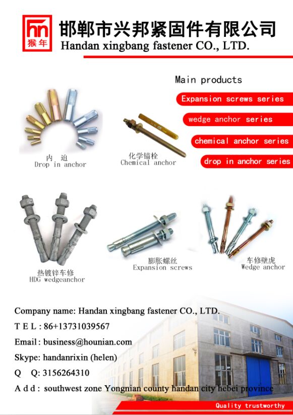 HANDAN CITH XINGBANG FASTENER CO .,LTD LOCATE IN YONGNIAN COUNTY ,HANDAN CITY ,HEBEI PROVINCE.THE FACTORY WAS FOUNDED IN 1992.OCCUPATION 10000CM,THE MAIN PRODUCTIONS ARE :ANSI WEDGE ANCHOR,DIN WEDGE ANCHOR ,ANSI DROP IN ANCHOR ,CUT ANCHOR .DIN?DROP IN ANCHOR .CHEMAICAL ANCHOR .SLEEVE ANCHOR SUCH US:FLANGE NUT SLEEVE ANCHOR,HEX BOLT SLEEVE ANCHOR ,EYE BOLT SLEEVE ANCHOR ,HOOK BOLT SLEEVE ANCHOR FIXED ANCHOR .........WE WILL SUPPLY WITH GOOD PRICE AND HIGH QUANLITY .